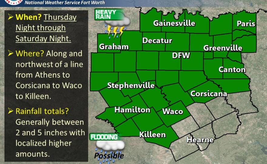 The National Weather Service says the heaviest rain will fall south and southeast of Dallas-Fort Worth, along a line from Killeen to Waco to Canton. Areas south of that line could get 2 to 4 additional inches of rain, the weather service says.