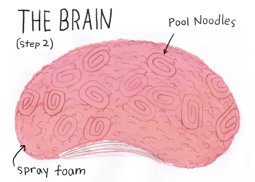 Today, the students are running around the science room collecting their puppet monsters. They're finally ready to attach them to the giant pink brain, a massive foam and wire structure that looks like a 2-ton jellybean.