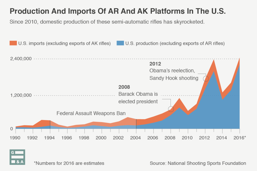 According to the National Shooting Sports Foundation, which represents the gun industry, Americans own up to 16 million ARs and similar "modern sporting rifles," as the foundation calls that class of gun. Production has exploded in the past few years, hitting an estimated 2.1 million in 2016, excluding exports.