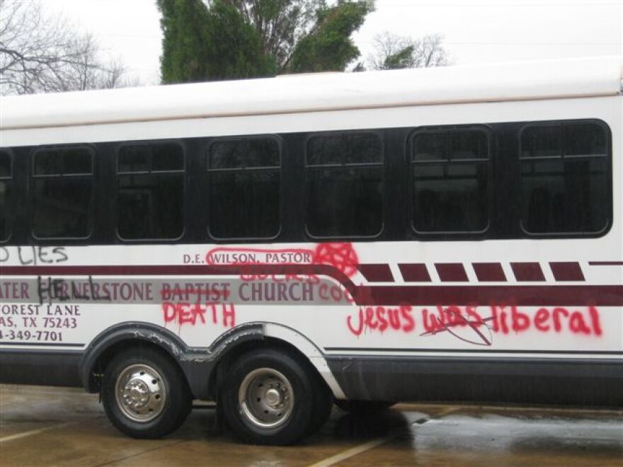 "Burn in hell" was painted by the church door. The side of the church bus was sprayed with messages that included "Jesus was a liberal".