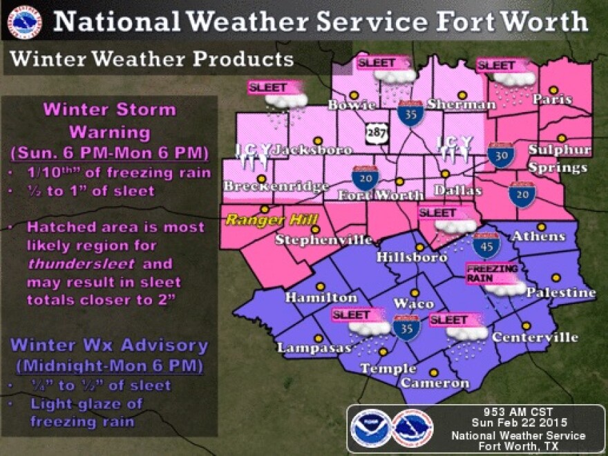 Update, 9:20 p.m. Saturday: The National Weather Service has issued a winter storm warning for most of North Texas, with up to an inch of sleet and freezing rain predicted between 6 p.m. Sunday and 6 p.m. Monday.